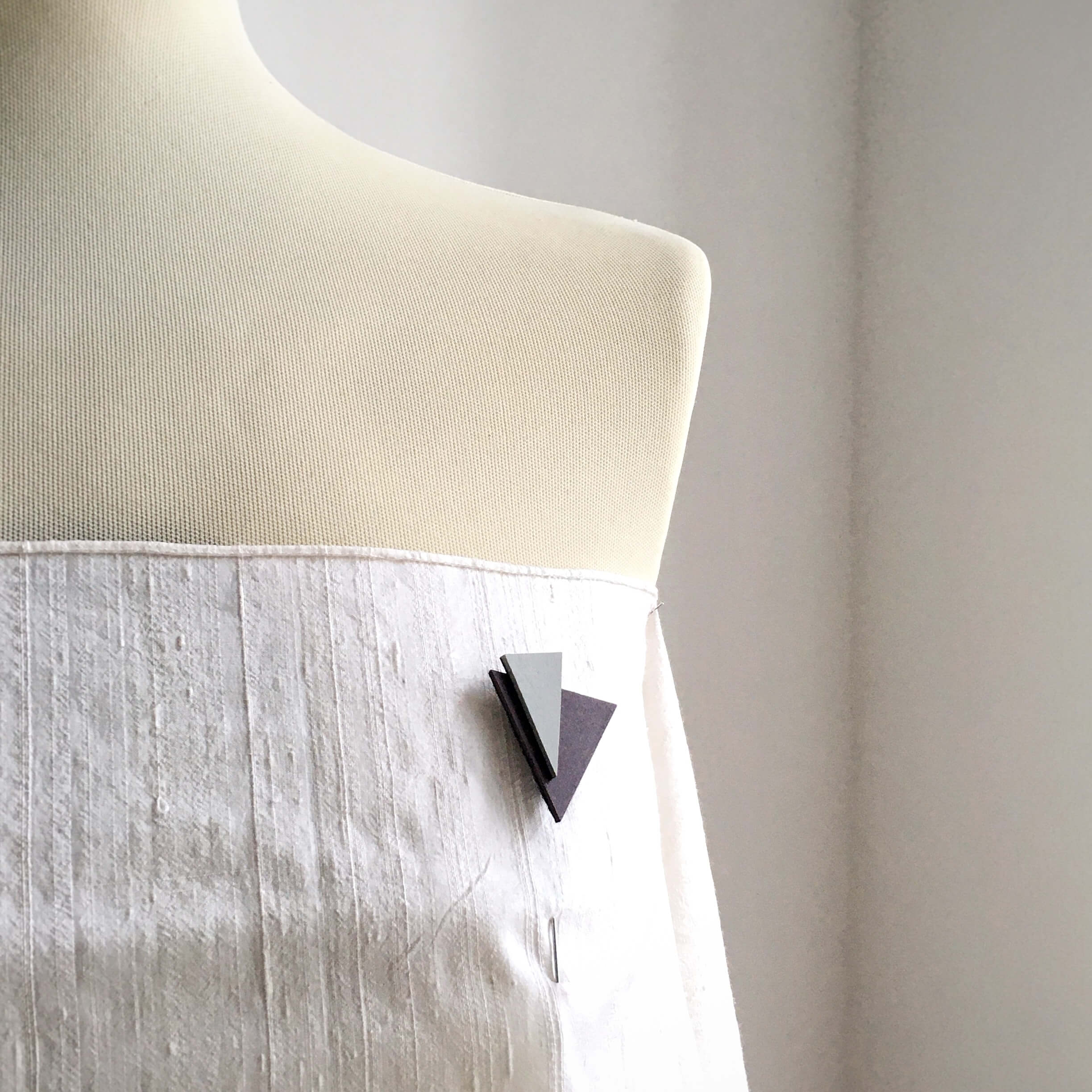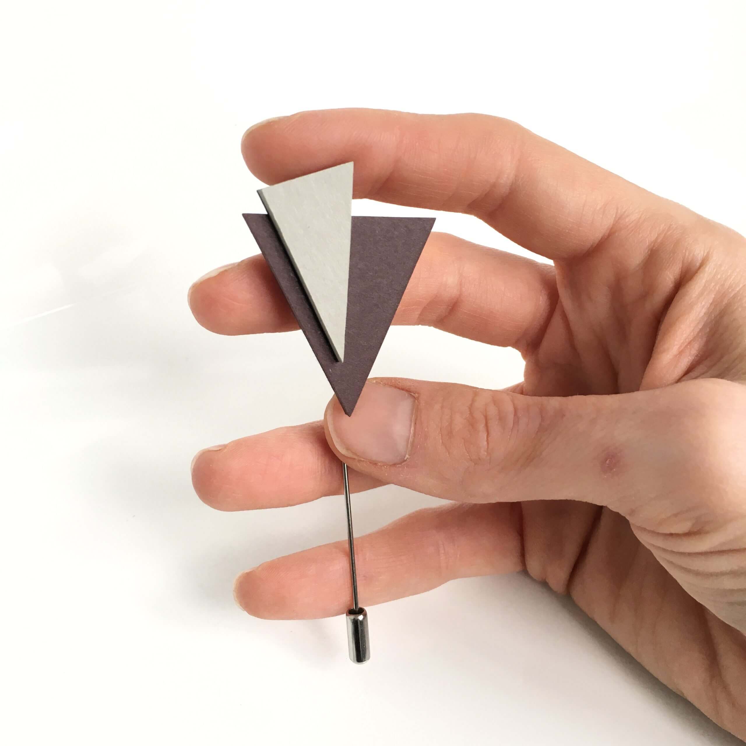 Geometric lapel brooch consisting of a burgundy and a gray triangle, minimal in its composition and sophisticated. With influences from the movement of suprematism, this discreet and beautiful detail will add a touch of elegance to the simplest top. Pin it on your blazers, coats and dresses or to fix a shawl. You can even use it as an alternative tie tack for your groomsmen!
